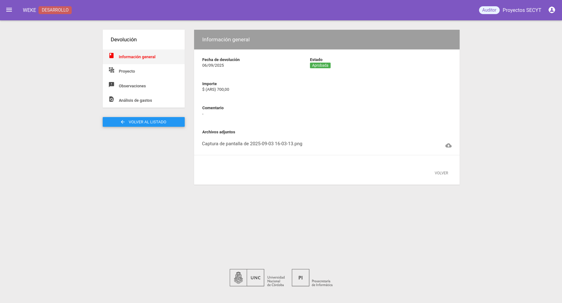 Detalle del Proyecto que se corresponde la devolución