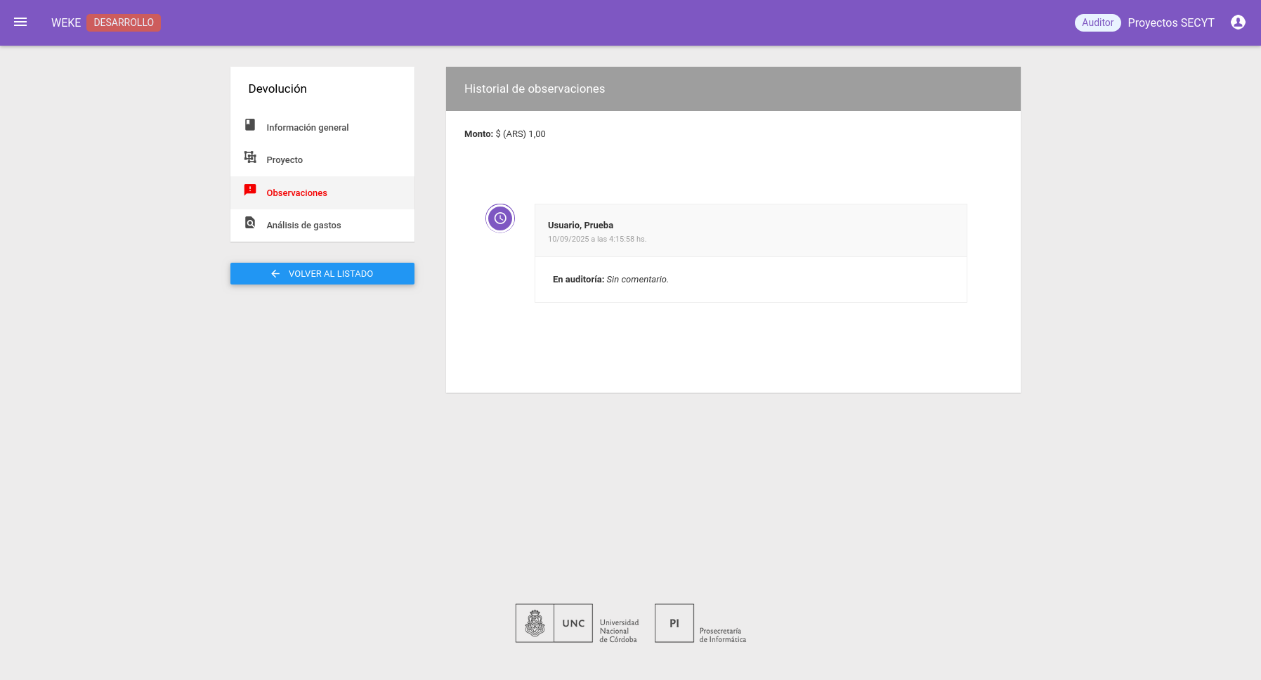Historial de las observaciones realizadas en la devolución