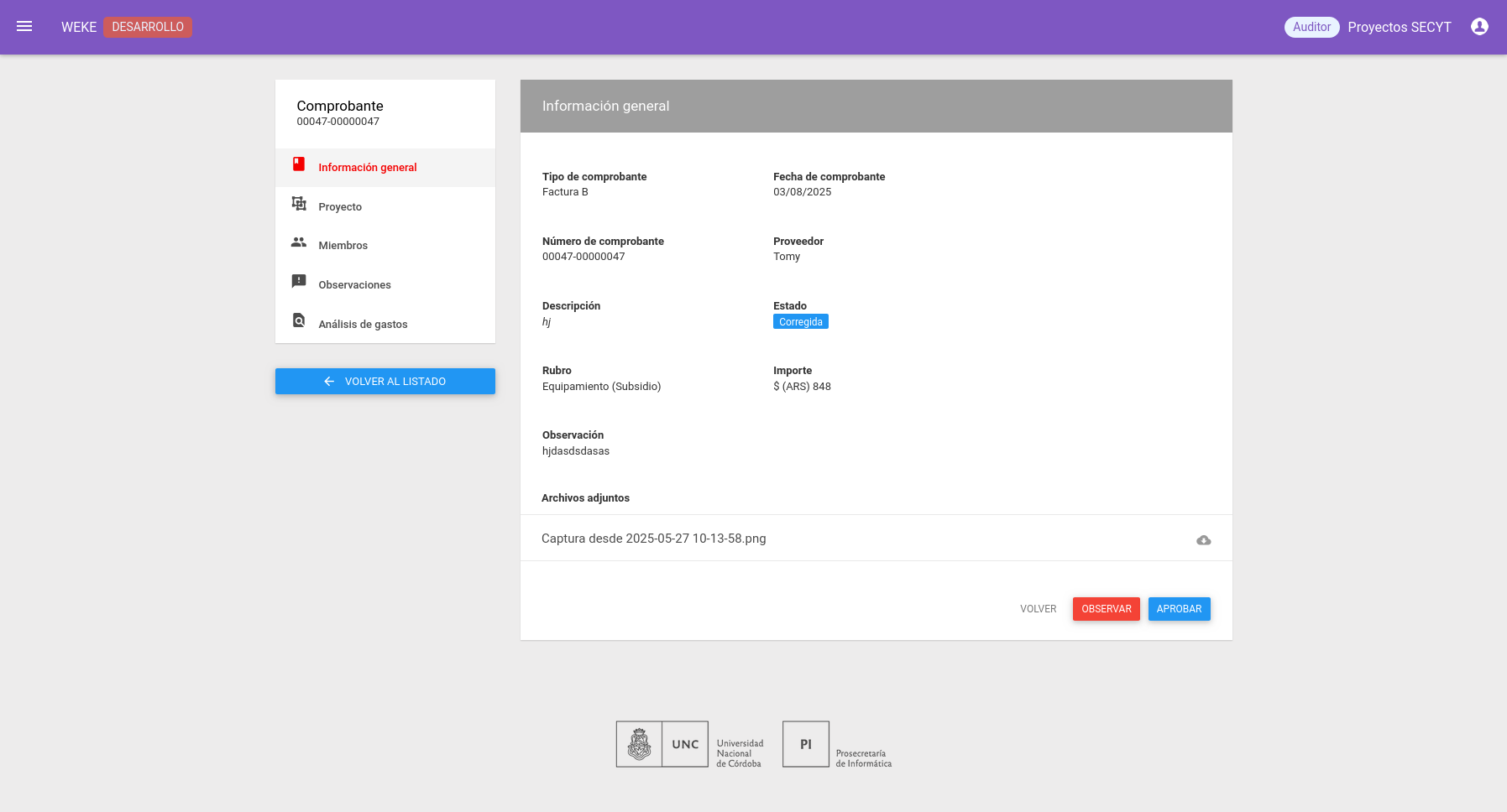 Un comprobantes en estado observada, el investigador puede corregirla y en el listado de comprobantes se puede visualizar